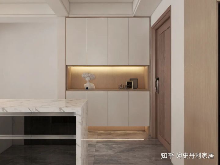 一旁靠墙设计玄关鞋柜,除了可放鞋外,门柜中部镂空,还可以摆放钥匙饰物等等。内嵌智能感应灯,靠近即亮,光线柔和,让空间成为高级的轻奢质感。