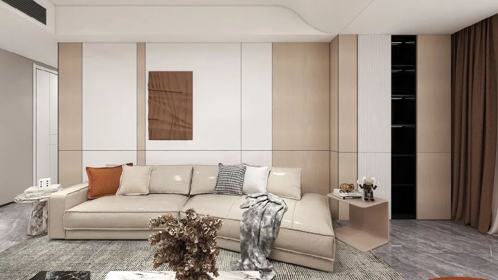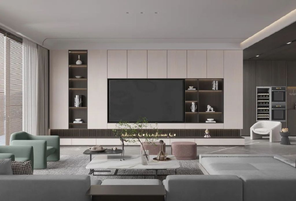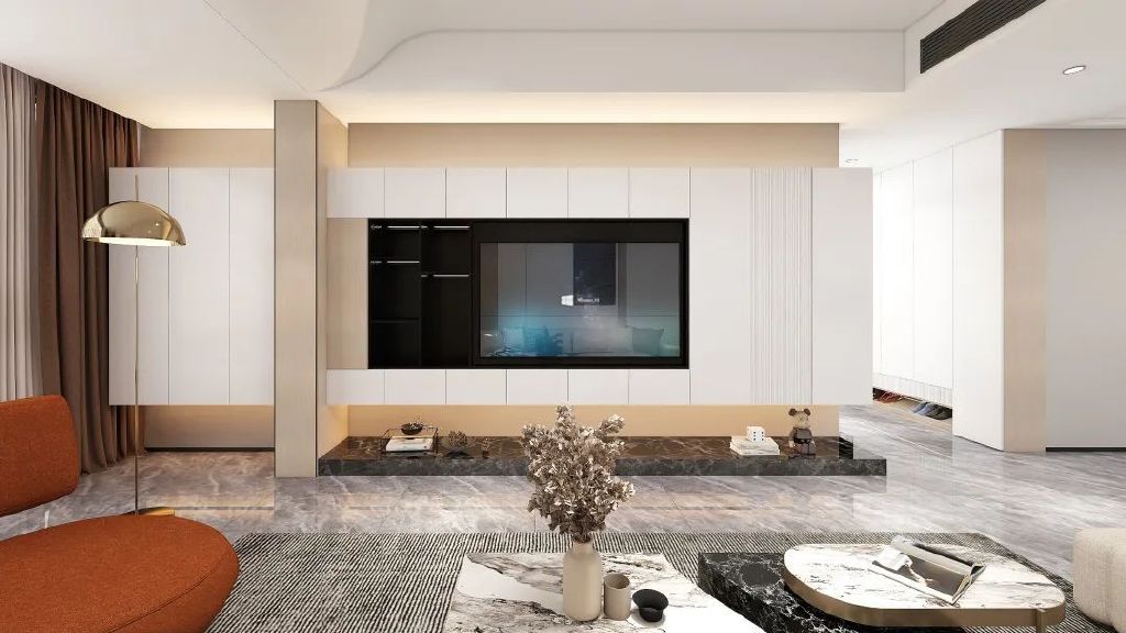 悬挂式电视柜是简约风格客厅中经常运用的设计元素。无把手设计就可以契合这个需求,柜门把手不会影响整体风格效果,而且显高端大气。